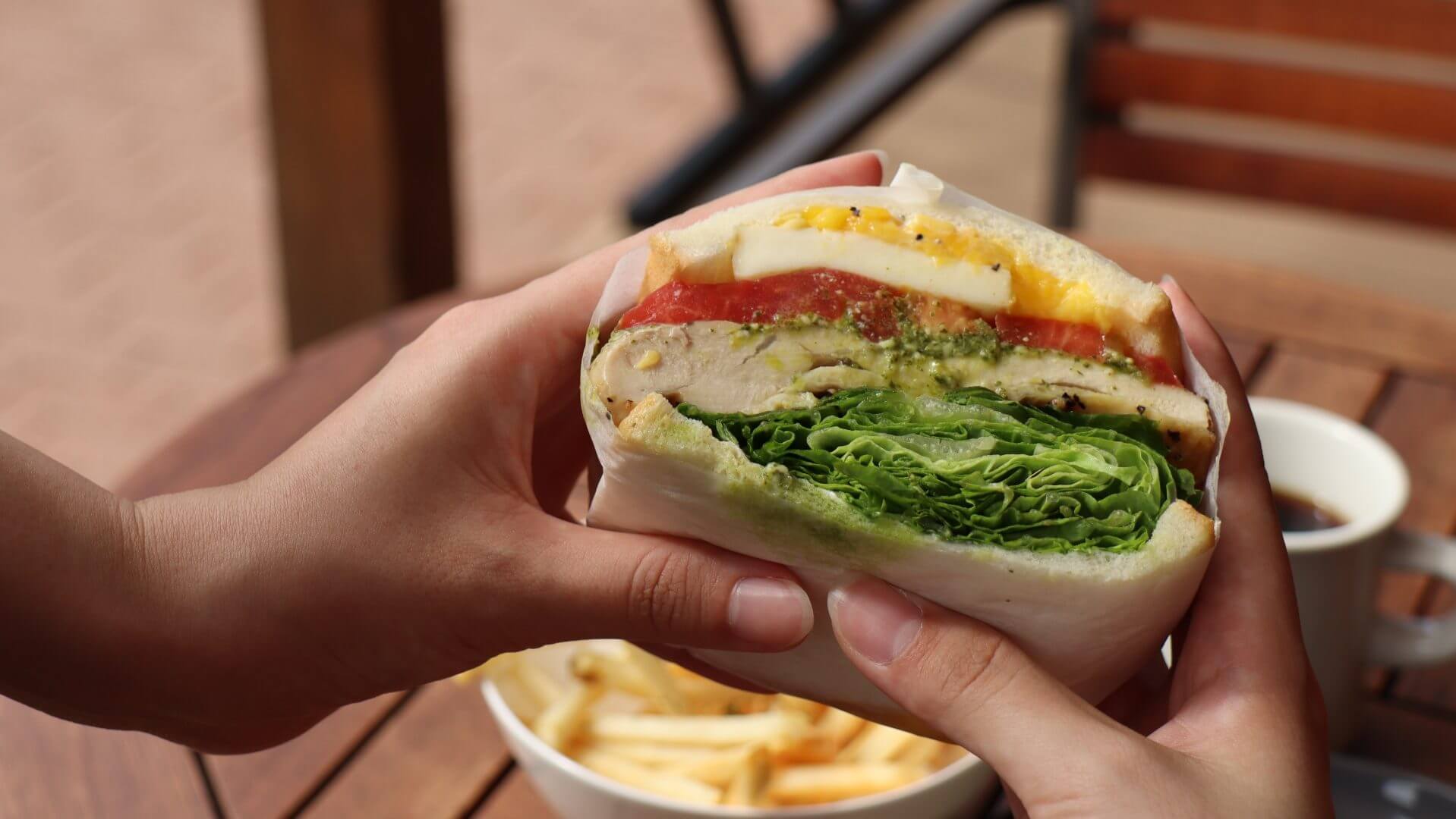 サンドウィッチは両手で持ってもずっしりとした重みを感じるほどボリューミー!