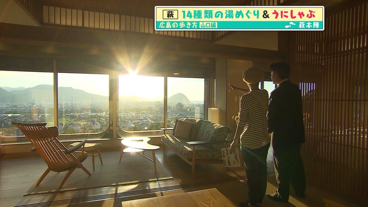 半露天風呂付の特別室「栞」など、萩市内を一望できる客室でくつろぐことができる
