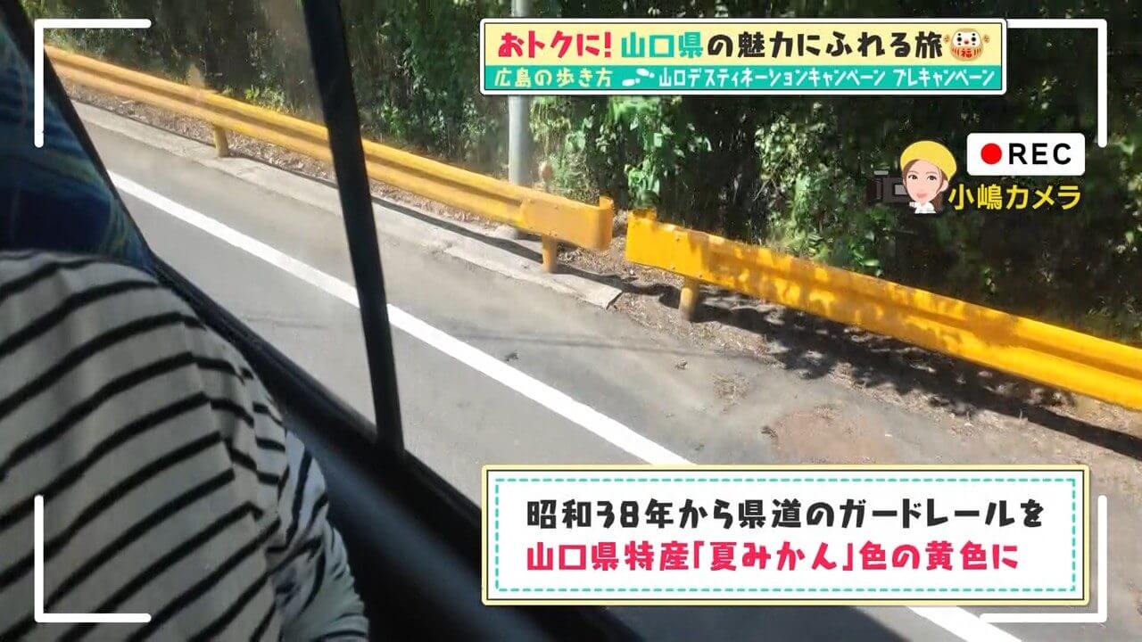 車内からは黄色いガードレールが見えます。昭和38年から県道のガードレールは山口県特産の「夏みかん」色になりました