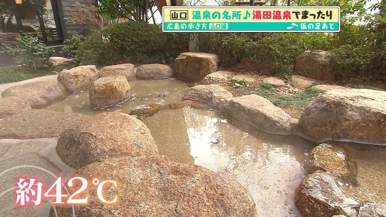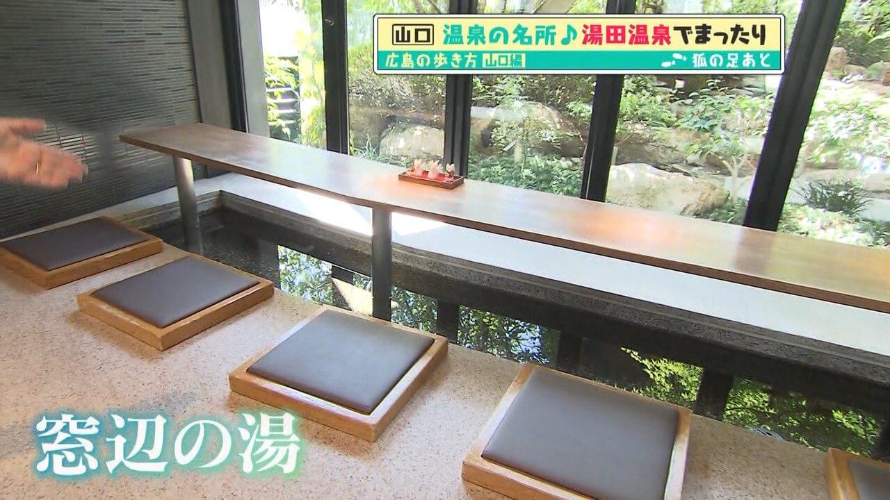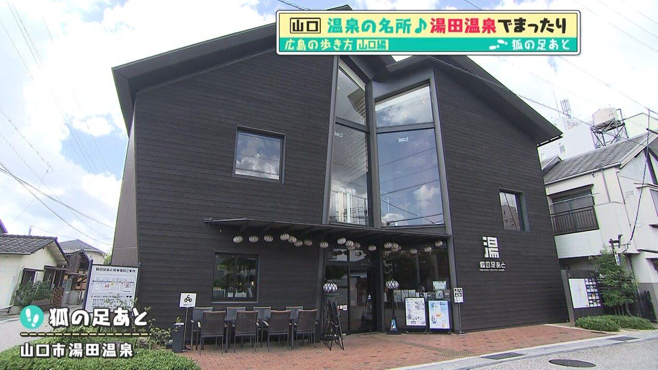 「山口デスティネーションキャンペーン」のパンフレットにも掲載されている「狐の足あと」は、足湯につかりながら、まったりと過ごせる施設。