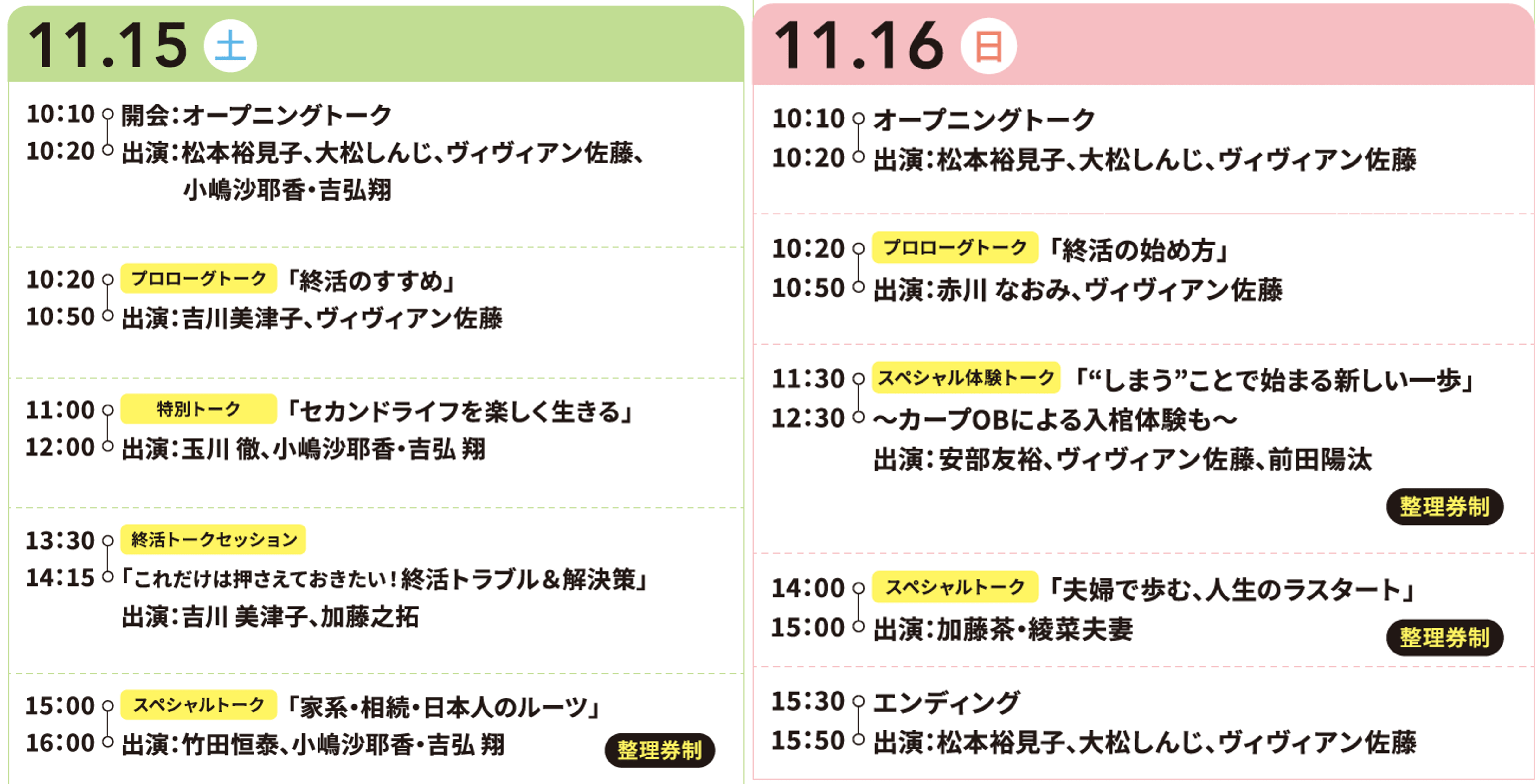 ゲストトークだけでなく、吉川美津子さん(終活ビジネスコンサルタント)、赤川なおみさん(エンディングノートナビゲーター(R))ら、専門家ステージも心に残る時間なのでぜひ。