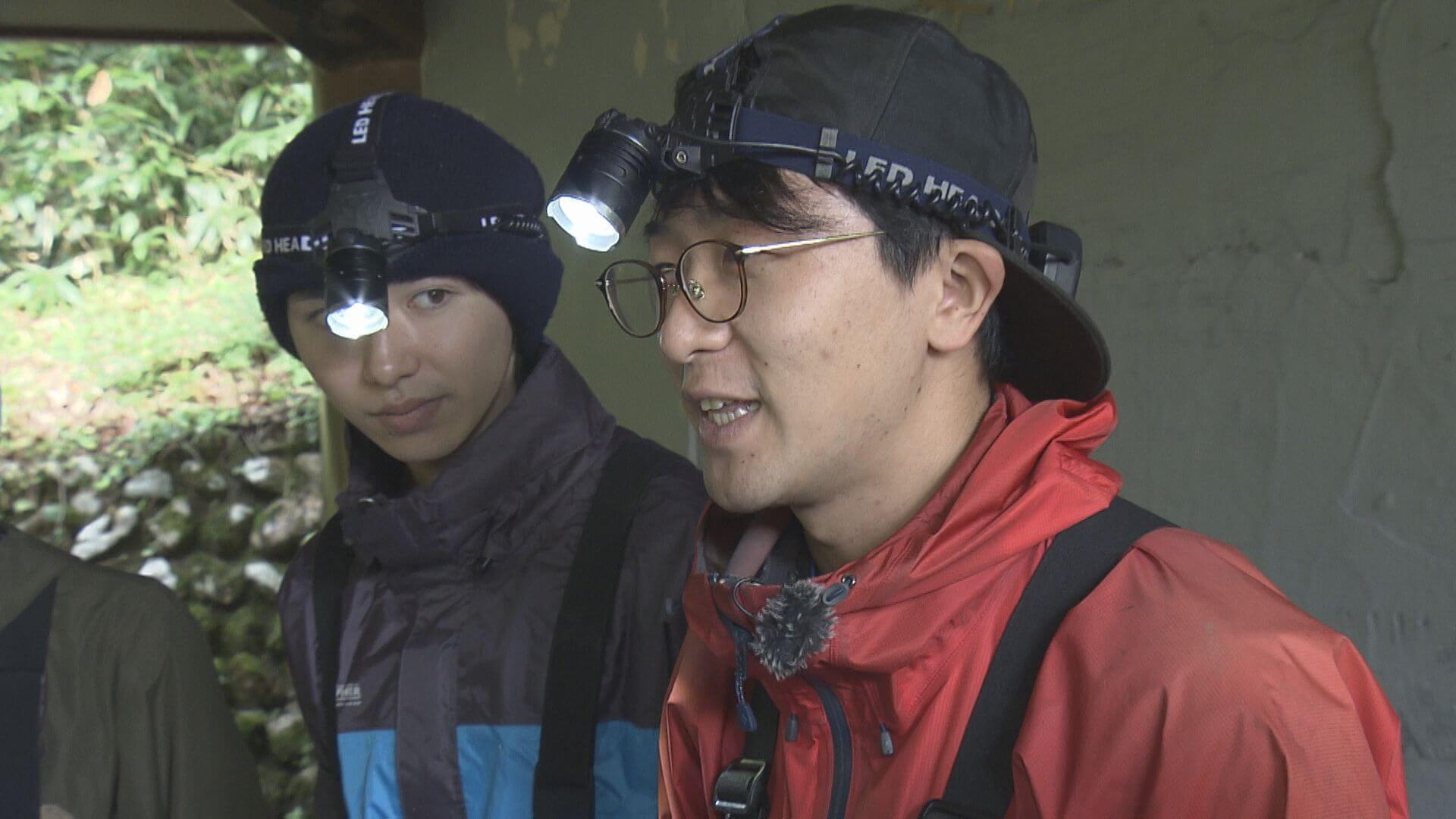 捕獲したゴギについて説明しているのは、愛媛大学大学院の佐々木悠人(ささき・ゆうと)さん。