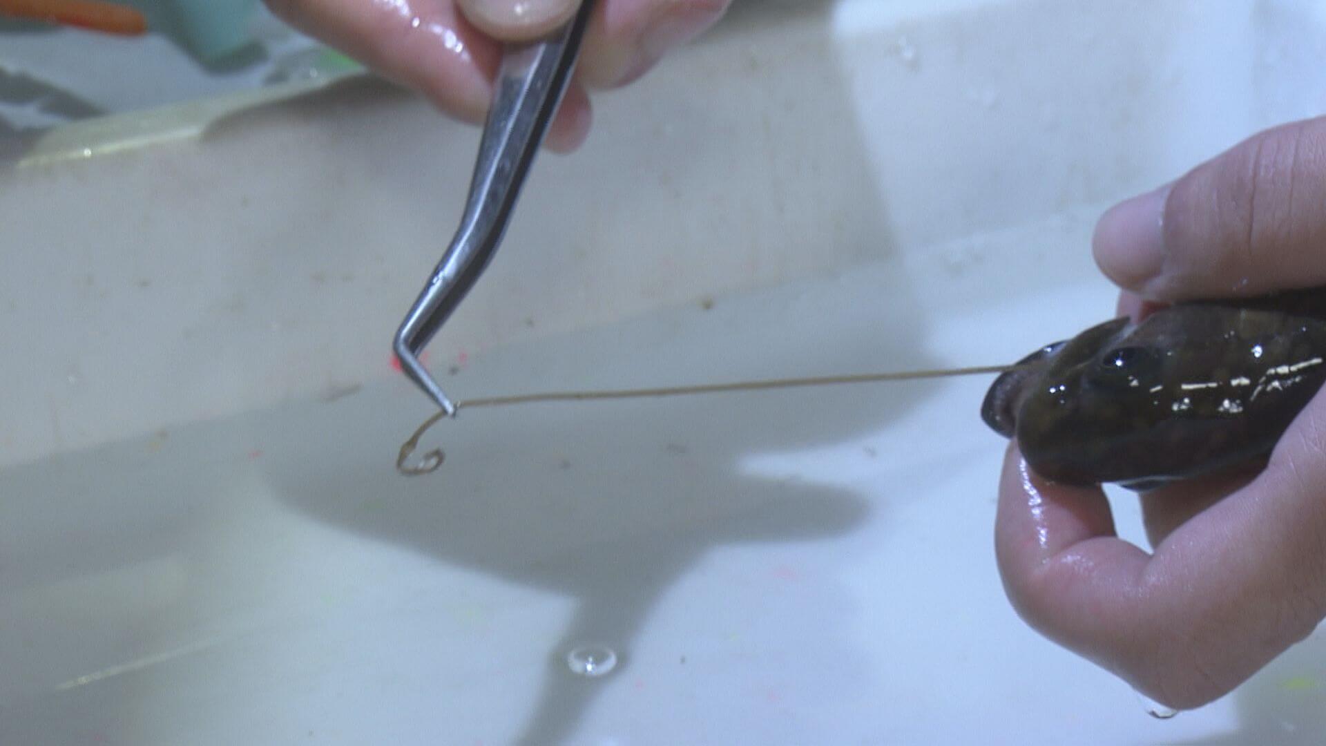 佐々木さんは「カマドウマというバッタに寄生して、バッタはこのハリガネムシに操作されて水の中に飛び込みます。飛び込んだバッタをゴギが食べている」と説明します。