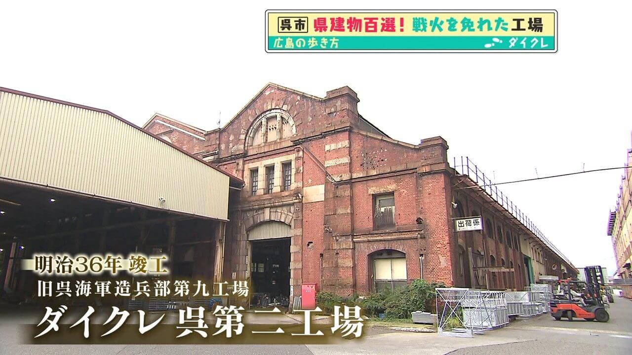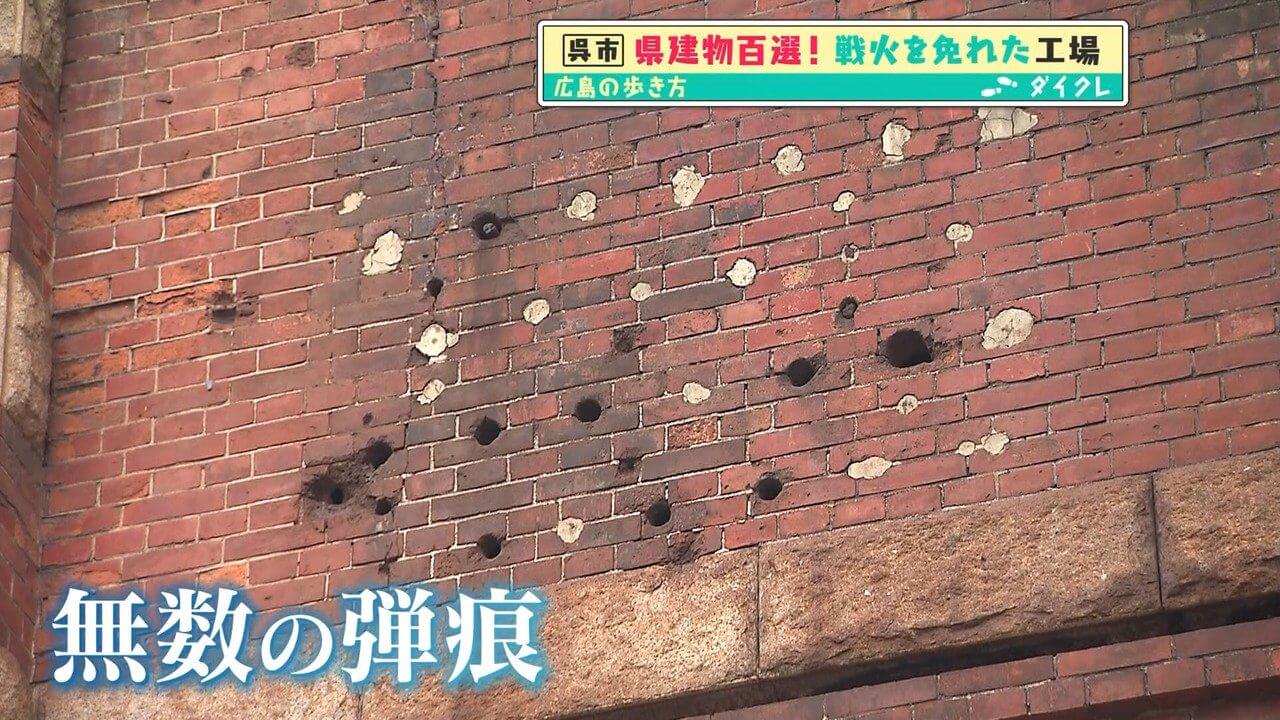 旧呉海軍造兵部第九工場だった建物で、外壁には砲弾の跡が残っています。