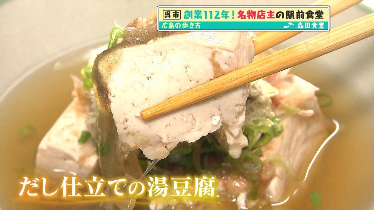 森田さんのイチオシは湯豆腐。音戸産のいりこだしと薄口しょうゆで味付けをした優しい味わいの一品。
