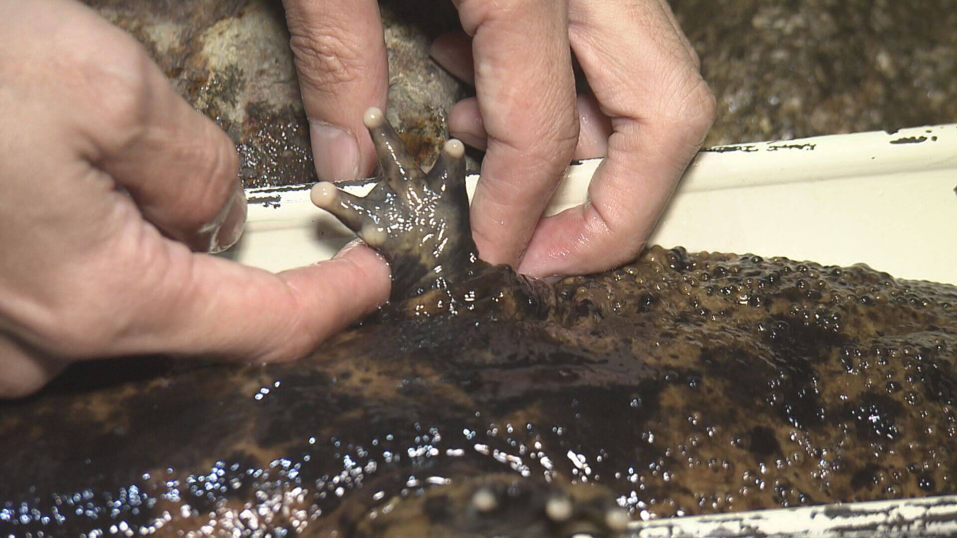 オオサンショウウオ生態保全教育文化研究所の田口勇輝所長は「こっちの前足は4本指があるが、反対側は3本しかない。どこかのタイミングでかみ切られてなくなっている。このオオサンショウウオはけんかっ早いというかアグレッシブなのかもしれない」と話します。