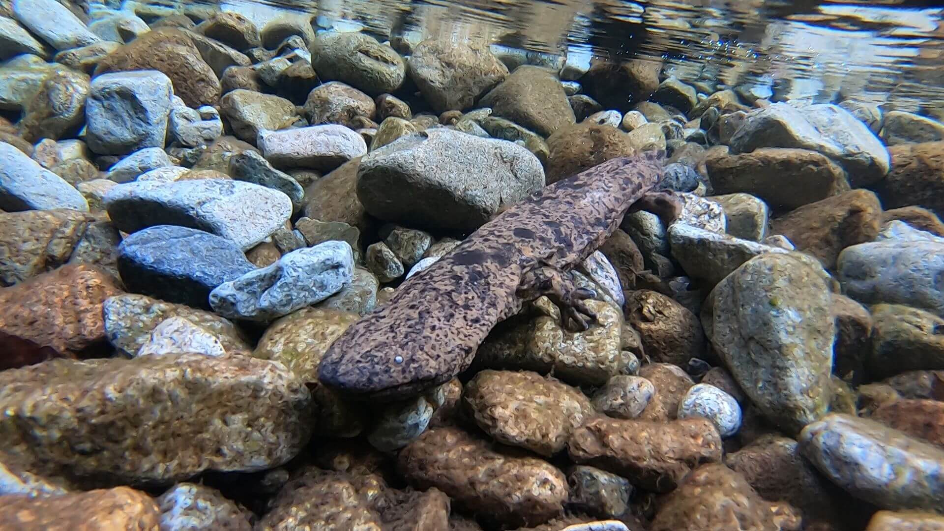 調査を進めると岩の下に隠れていたオオサンショウウオを発見しました。