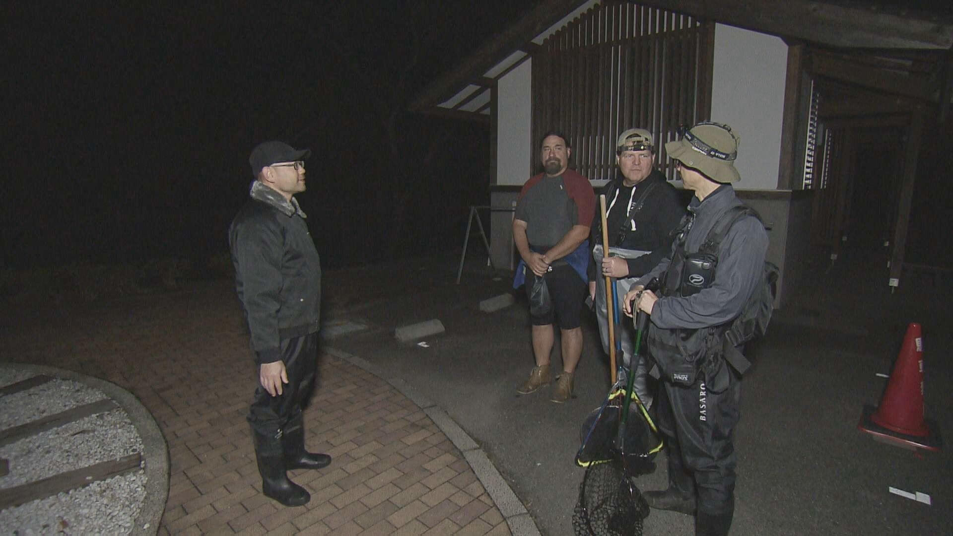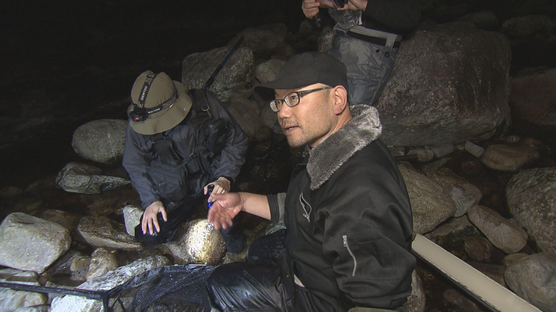 真っ暗な川の中で探しているのは、国の特別天然記念物、オオサンショウウオです。