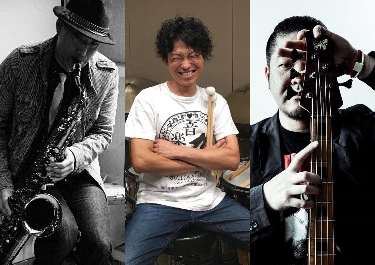 左から藤井政美(Sax)、山口圭一(Drums)、山本優一郎(Bass)