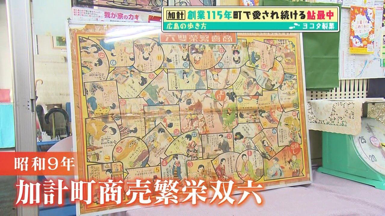 ヨコタ製菓の歴史を感じることができる、昭和9年の「加計町商売繁栄双六」を見せてもらいました。