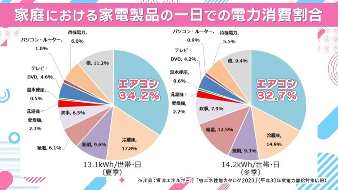 松永さん「そうなんです。資源エネルギー庁の調査によると、夏季冬季ともに家庭での電力消費割合の第1位がエアコン、次いで冷蔵庫、照明となっています。つまり、最も電力を消費するエアコンの使い方を見直すことが、節電の最大のカギになります」