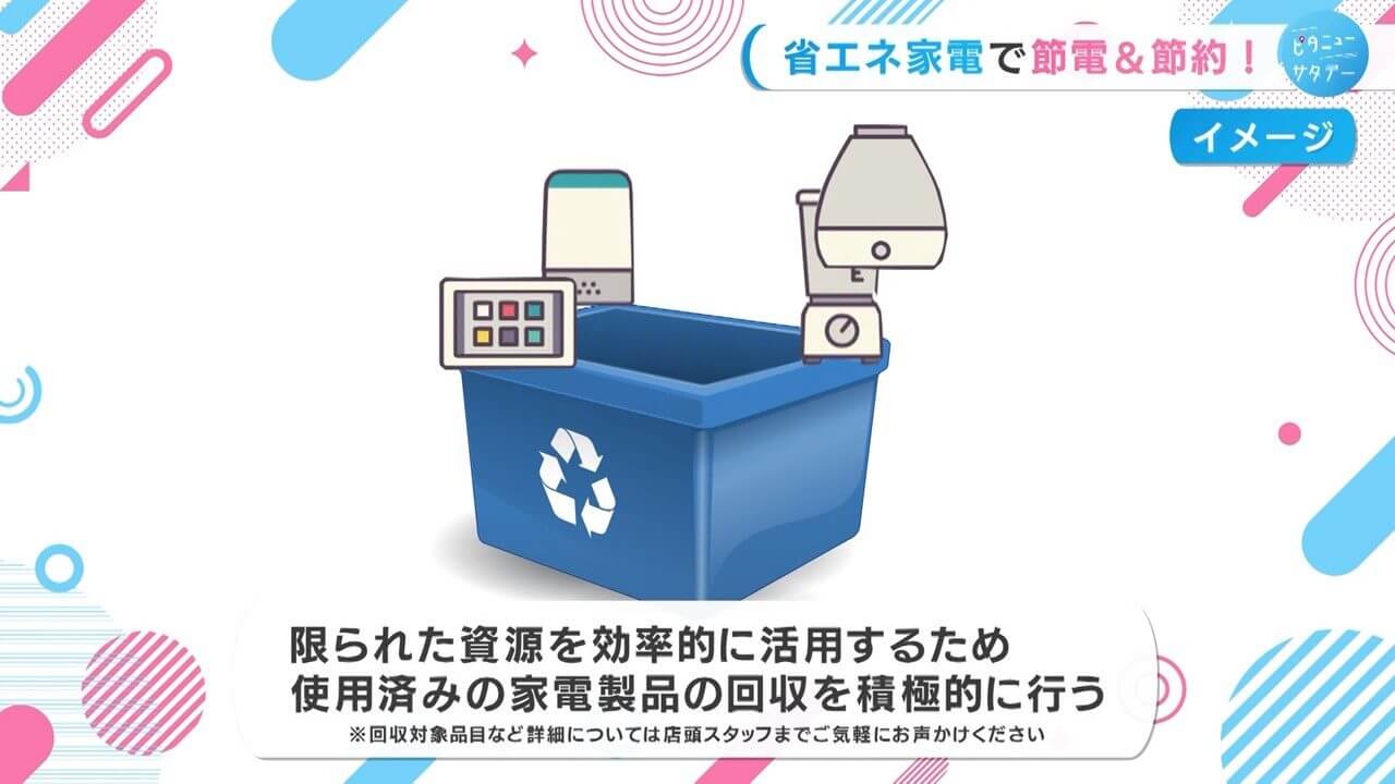 エディオンでは限られた資源を効率的に活用するため、家電リサイクル法の対象である使用済み家電製品の適正な処理や、小型家電のリサイクル、小型充電式電池の回収なども積極的に行っています。