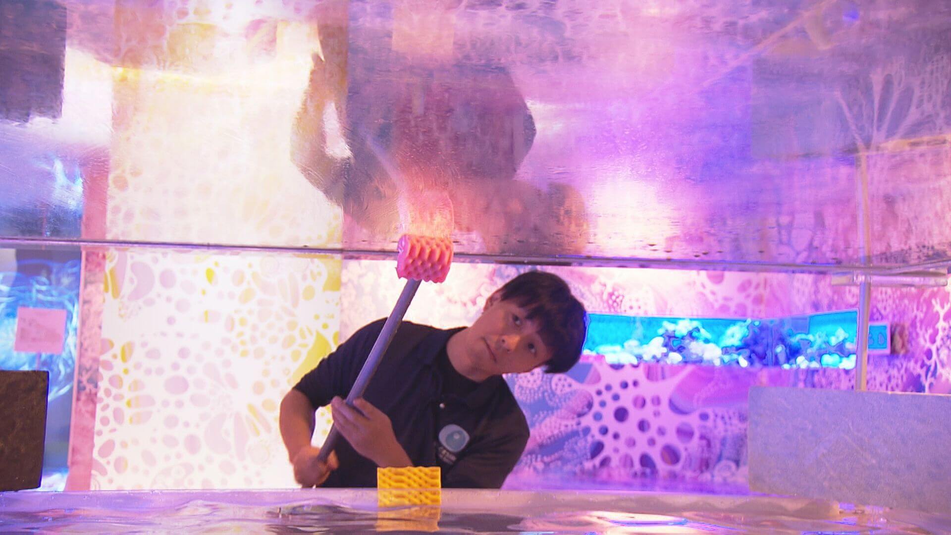 飼育員の中島(なかしま)さんは、水槽が並ぶ真っ白な部屋で汚れた水とゴミの掃除をしていました。