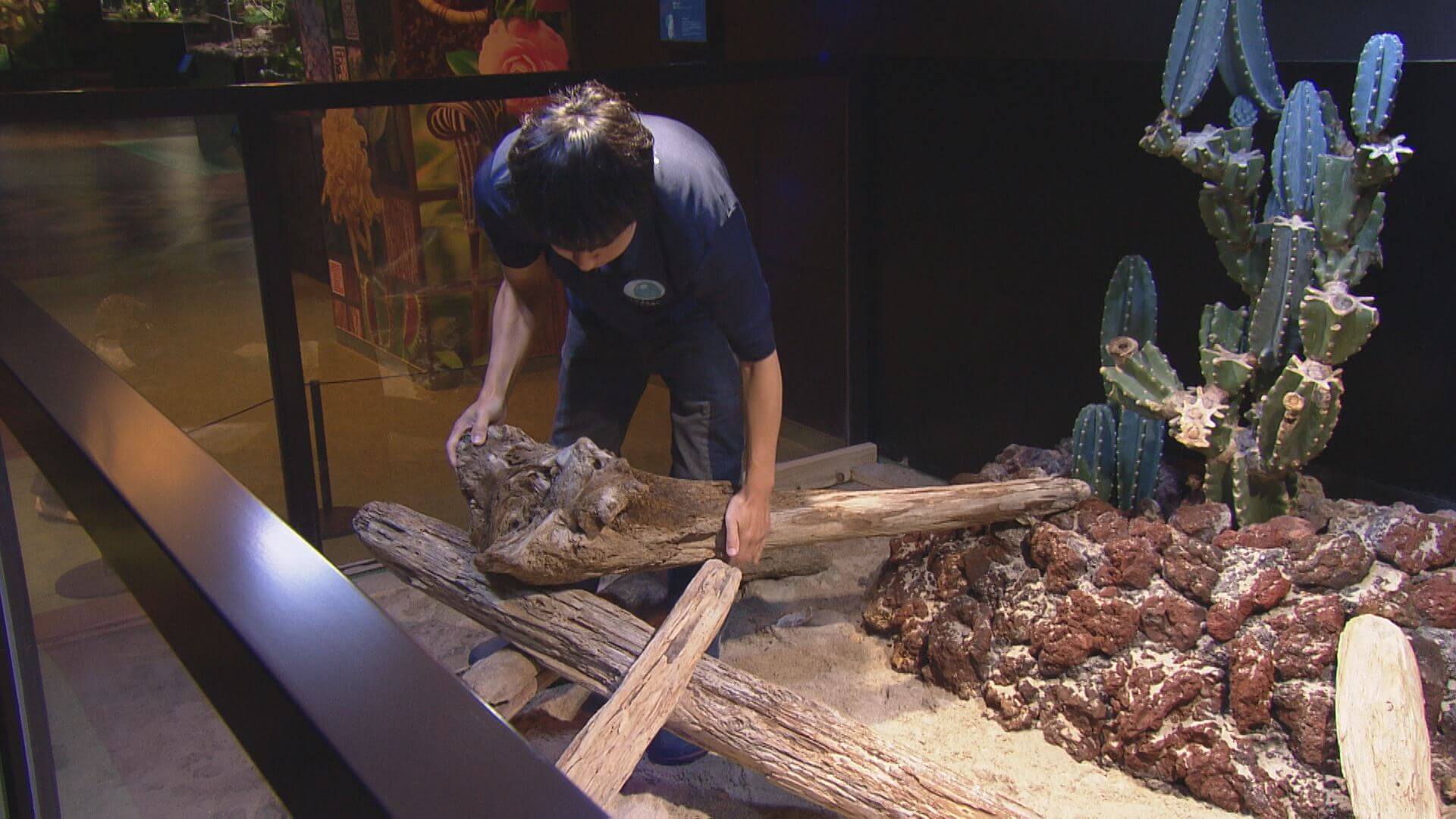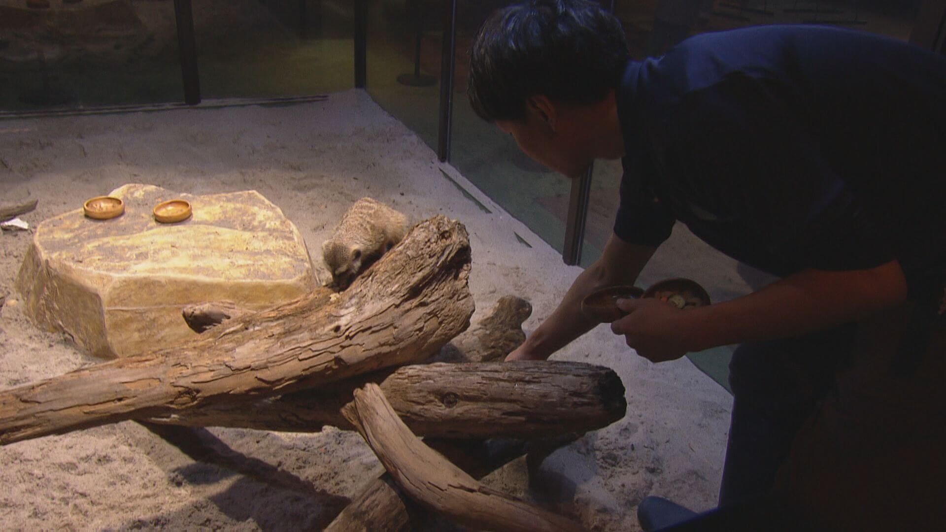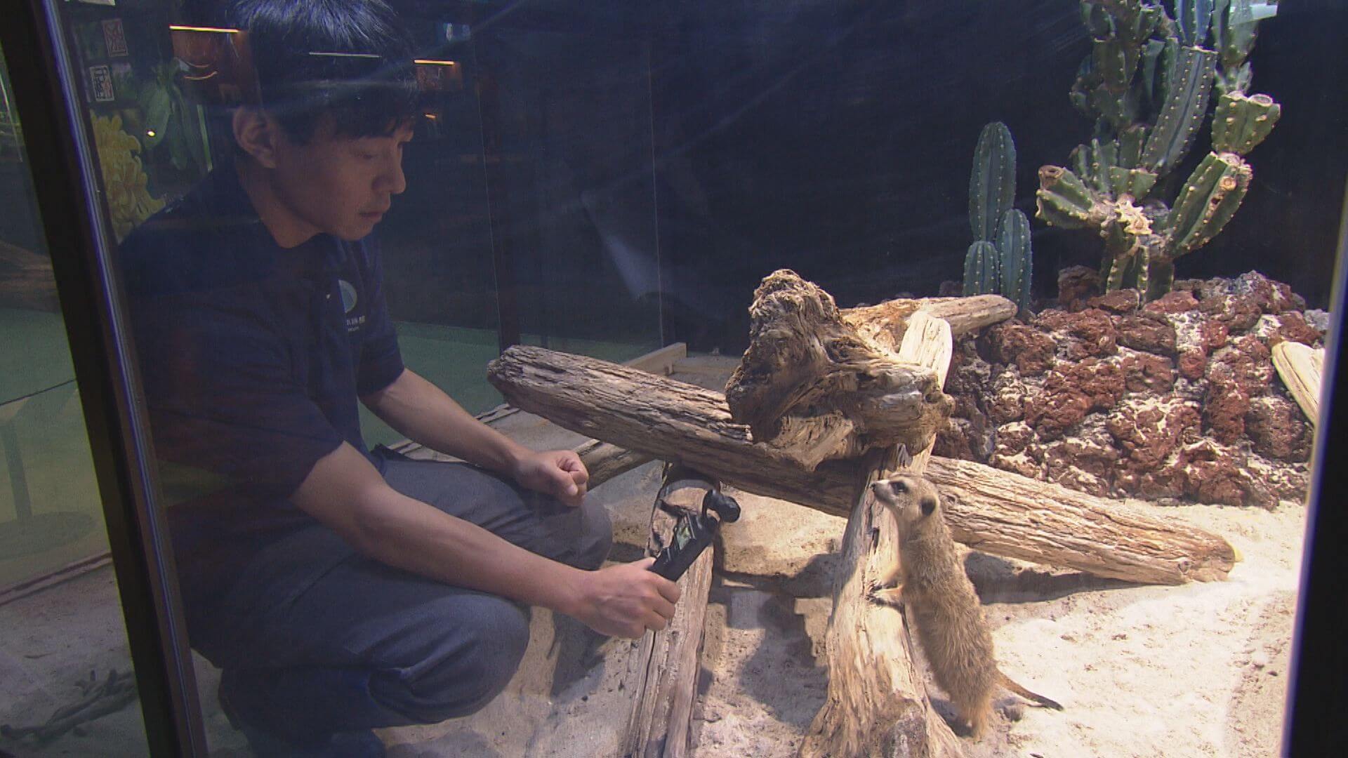 ミーアキャットがエサに夢中になっている間に、中島さんは展示スペースの木を動かし始めました。