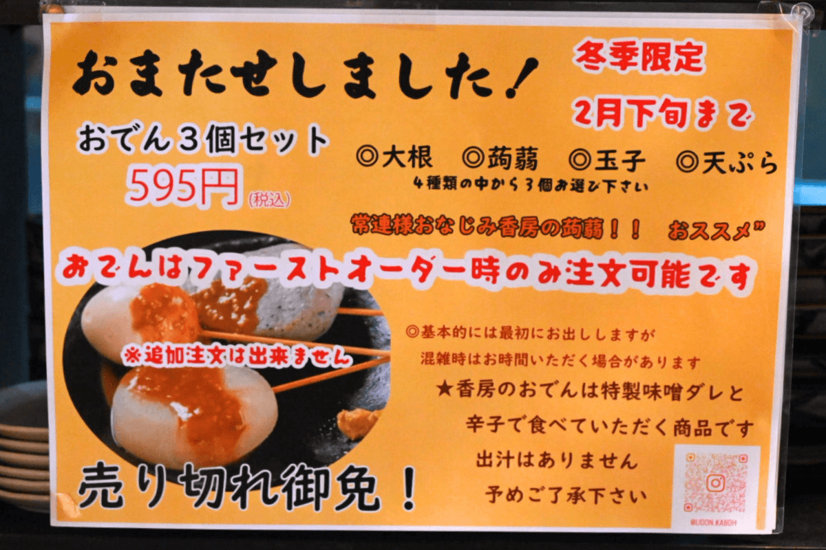 ※提供期間は変更になる場合があります。終了時期は公式SNS(https://www.instagram.com/udon.kaboh/)でお知らせがあります。