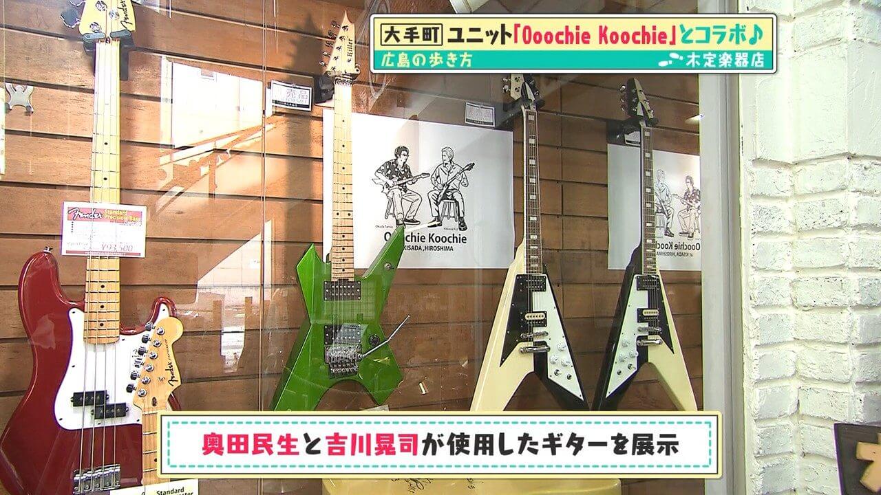 奥田民生さんと吉川晃司さんが使用したギター。お二人は上京する前、木定楽器店を訪れることもあったそうです