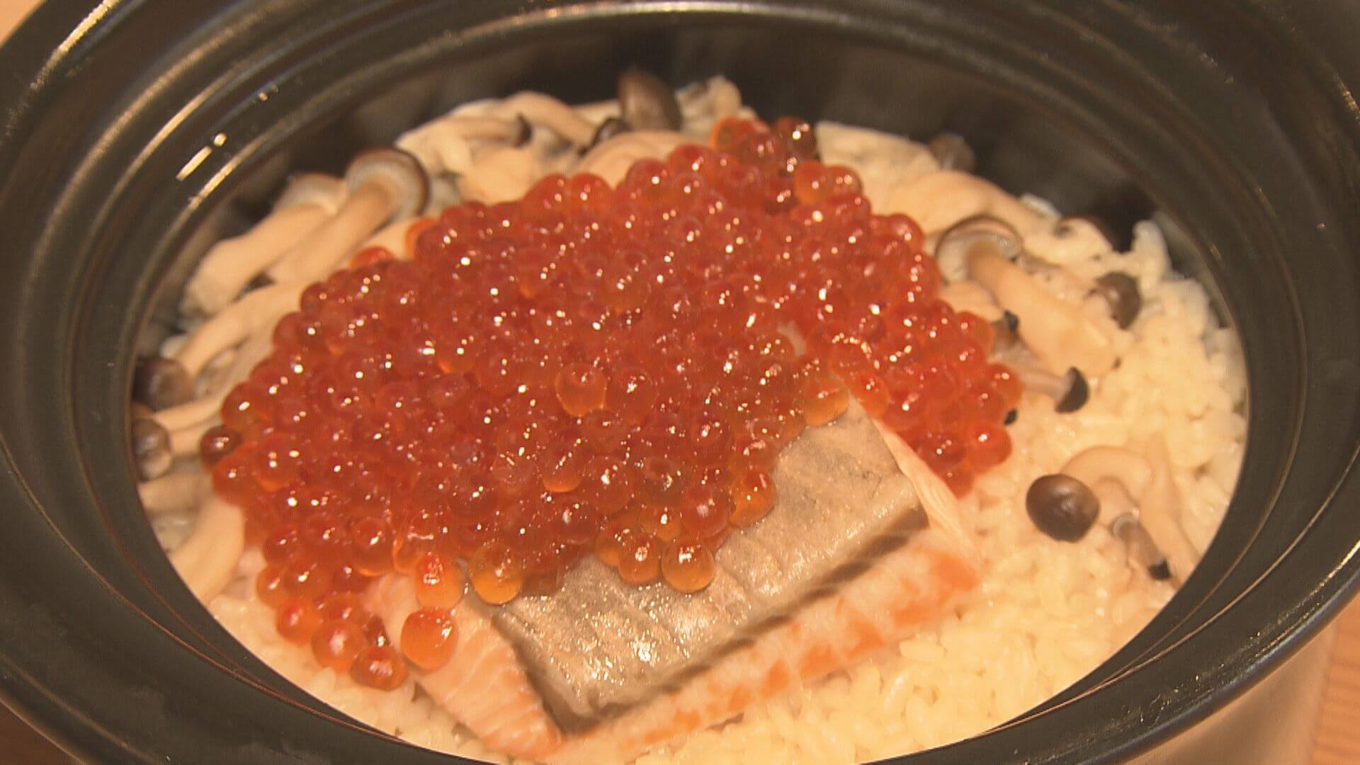 岡本アナ「一番だしは炊き込みご飯にも使われています。出汁のおいしそうな良い香りがふわ~っと広がります。サーモンにいくら……贅沢な炊き込みご飯です」