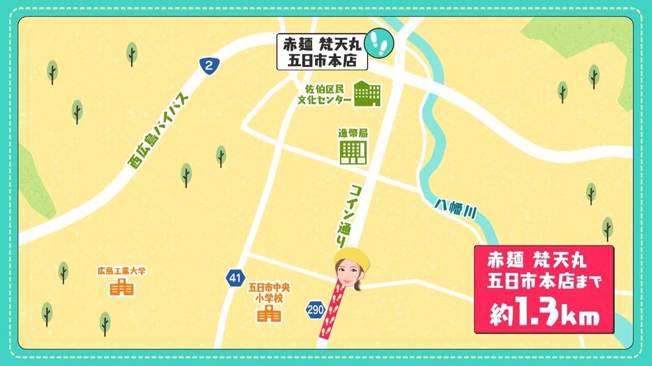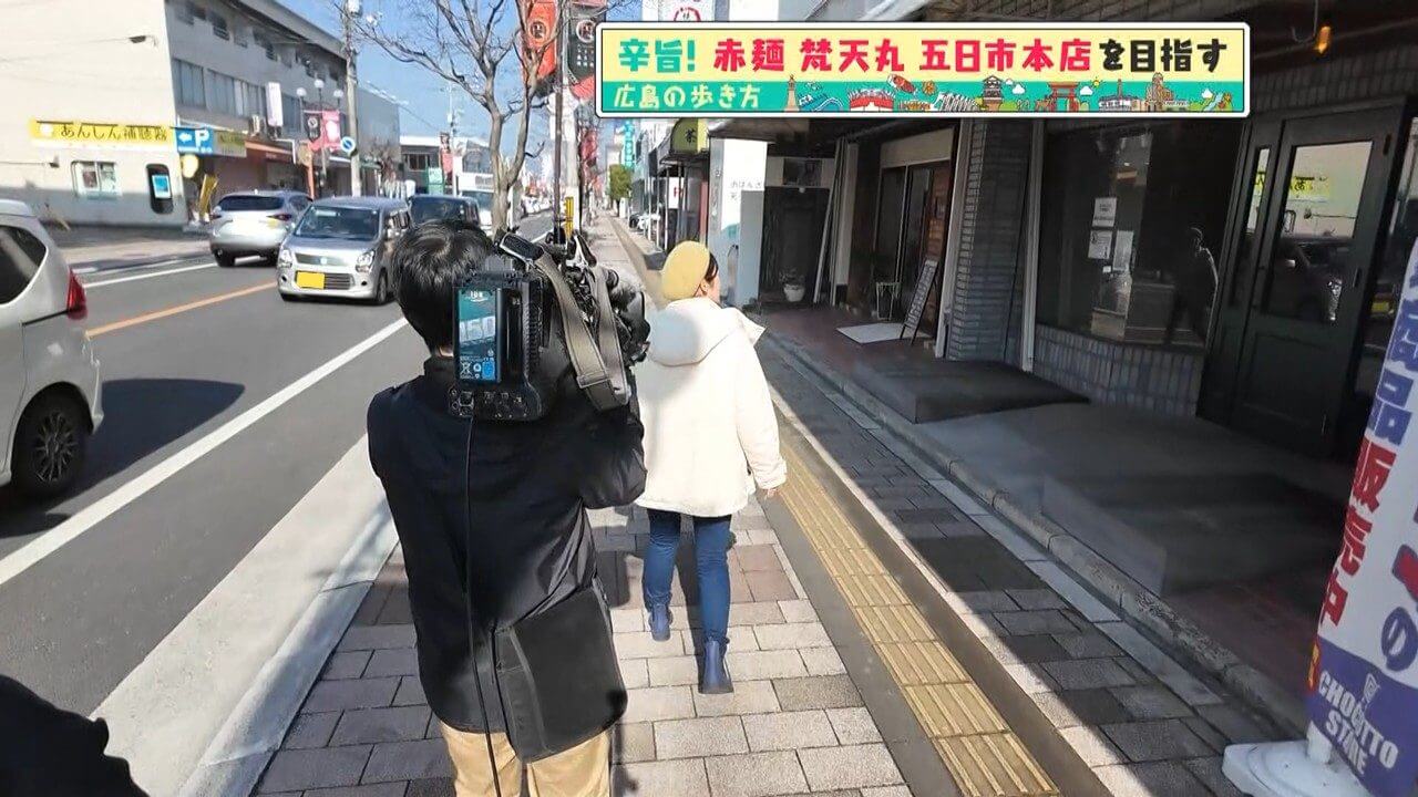 前回訪れた「甘味処 夢於」を後にし、「赤麺 梵天丸 五日市本店」を目指して歩き始める小嶋アナ。