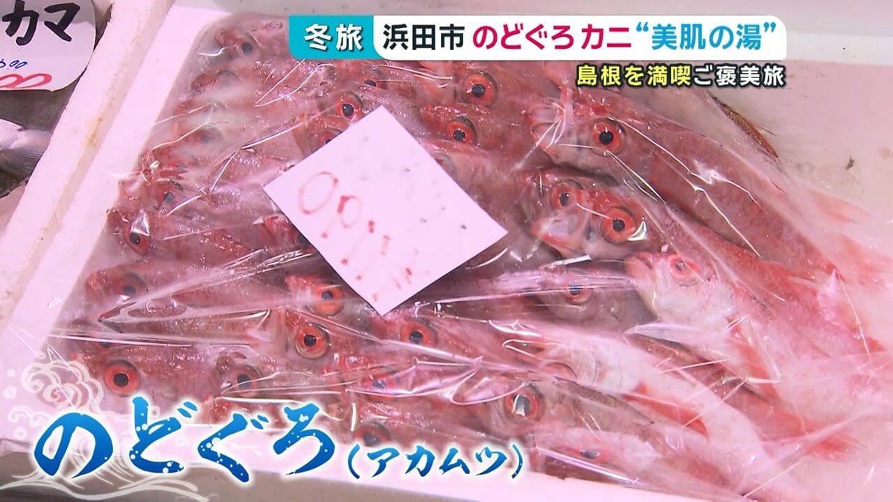 そして、山陰浜田の海の幸といえば「のどぐろ(アカムツ)」。この日の朝揚がったばかりののどぐろは色鮮やか!