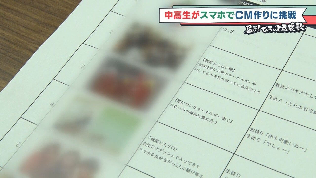 これはグループでアイデアを出し合いCMの構成をまとめた絵コンテ。
