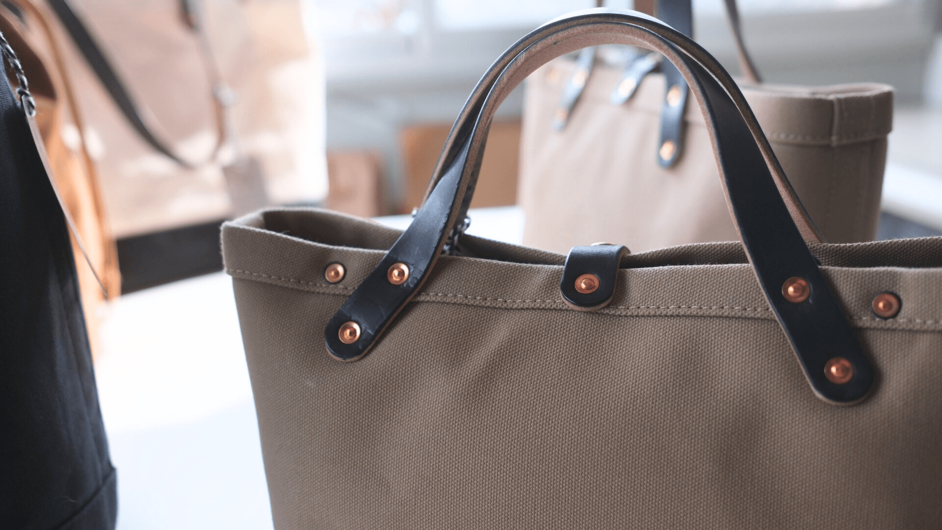 「もともと革が好きで、靴職人に憧れていたこともあって革が使いたかったんです。持ち手を留めている金具は、昔アメリカなどでよく使われていた『コッパーリベット』と呼ばれるもの。帆布と革に銅の金具を通して、一つ一つ叩いて成形しています。厚い生地も革もしっかり留まるので、心配なく使っていただけます」