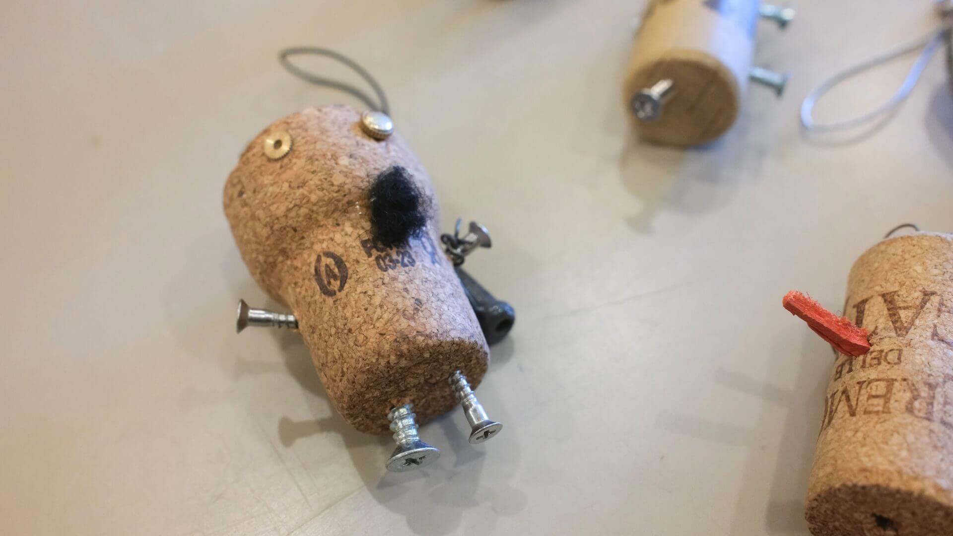 飲食店のコルクはボディに、時計店の歯車は目に、グローブ店のフェルトは髪の毛に。