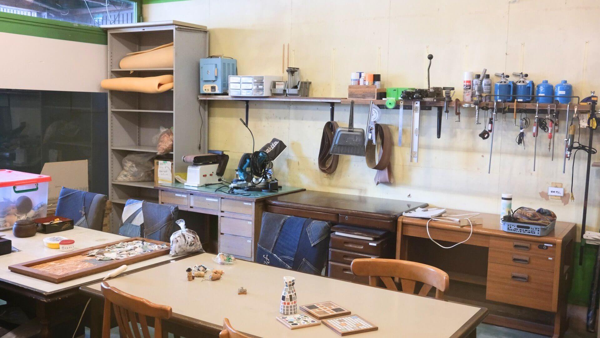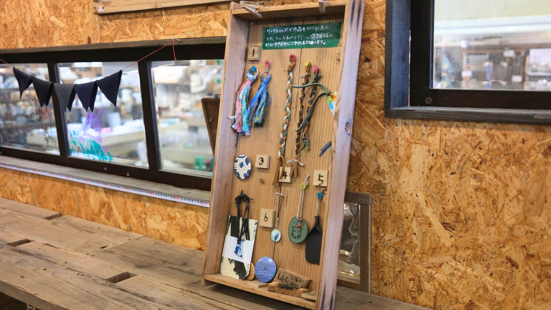 「ナガスタ」のワークショップで作れるものを見せてもらうと、革や古布を使ったキーホルダーやカラフルなタイルを敷き詰めたフレームが。