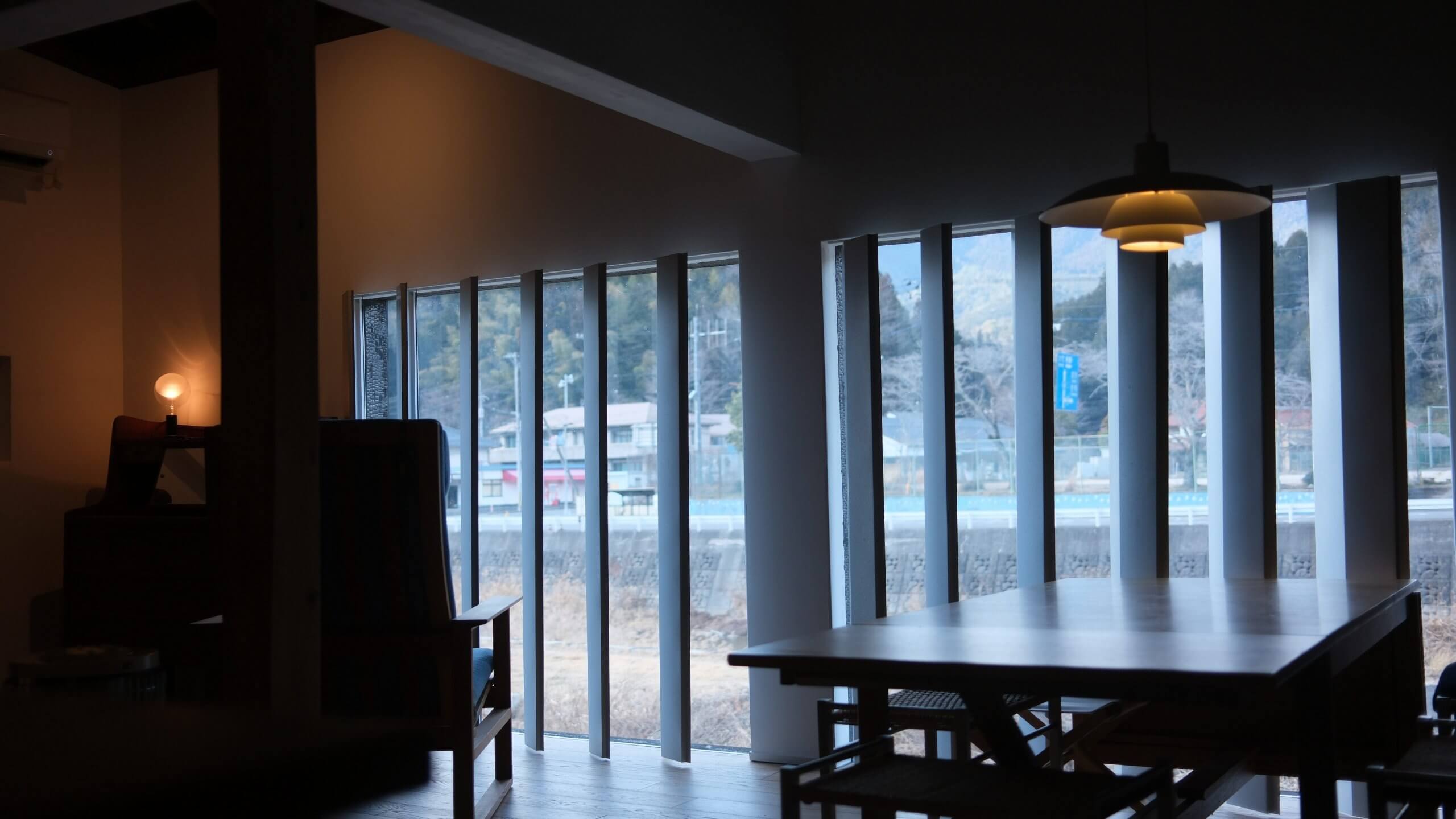 小瀬川に面した窓は、横に置かれた椅子に座ると川向こうの山まで見える高さにしたのがこだわり。