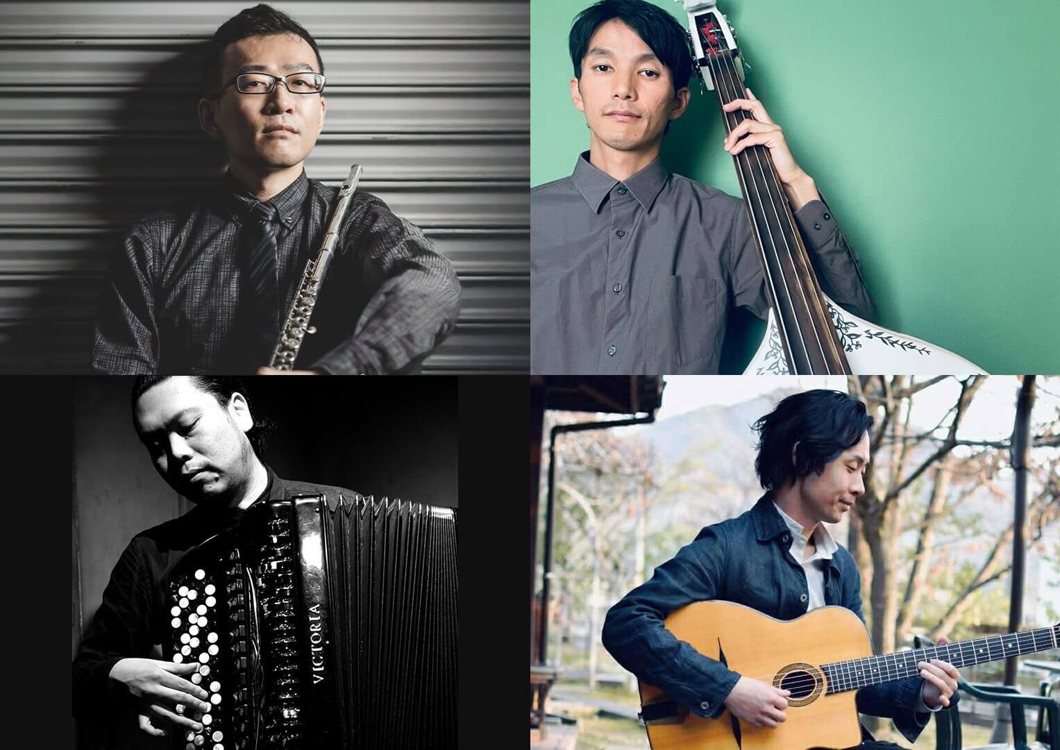 左上から時計回りに太田和孝(flute)、是盛博司(bass)、ニシウラトモアキ(guitar)、原田忠(accordion)